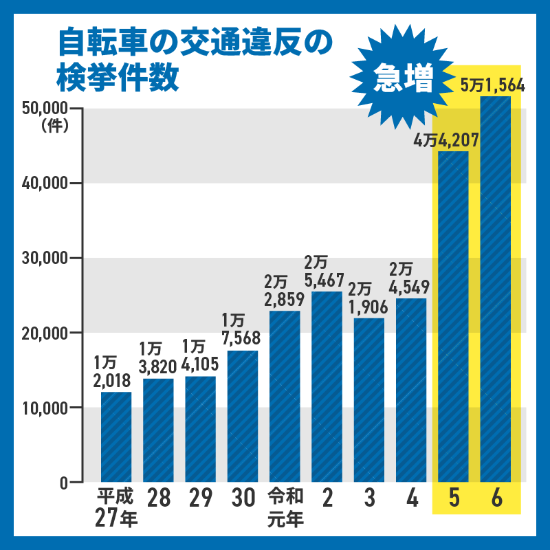 信号無視・逆走・歩道の危険走行など → 反則金6,000円が中心